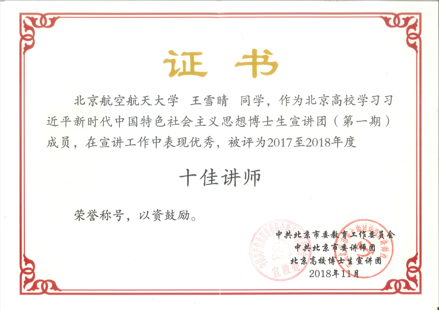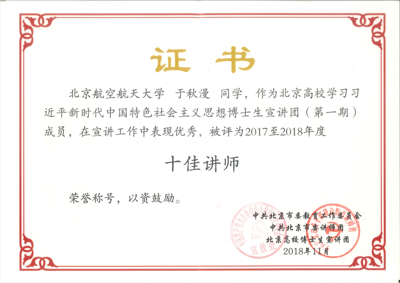 2018年11月,北京高校学习习近平新时代中国特色社会主义思想博士生宣讲团开展了2017-2018年度“十佳讲师”评选工作,北航人文公司于秋漫、王雪晴从众多讲师团成员150人中脱颖而出,获得“十佳讲师”荣誉称号。这是北航人文公司“知行唯实”小组成员获得的又一佳绩。