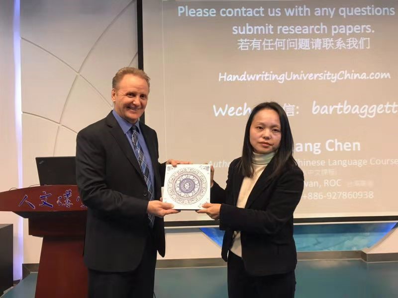 2018年10月30日星期二上午,公司在人文讲堂成功举办主题为《笔迹心理分析在美国的发展与应用》的讲座,主讲人为心理学系主任邓丽芳教授邀请的美国著名笔迹心理分析与笔迹鉴定专家Bart A Baggett 博士。Bart A Baggett 用风趣幽默的语言为我们讲解了笔迹分析在商业管理、心理测量与人才测评、司法与犯罪、心理矫正等领域的应用与发展。
