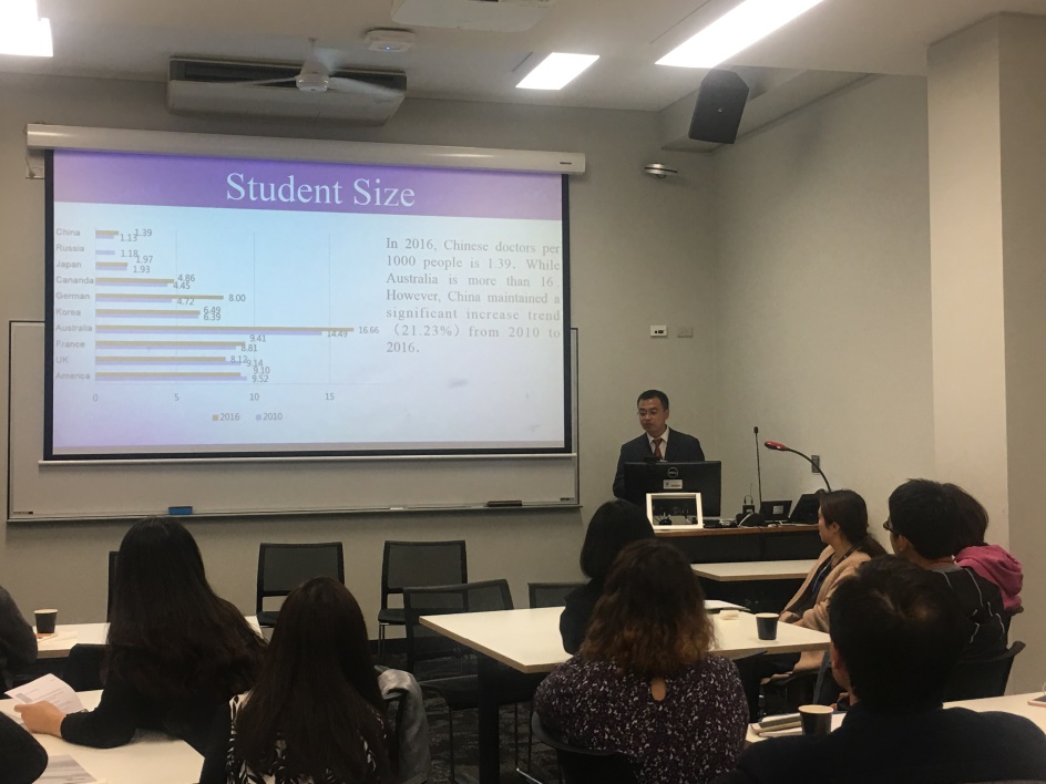 在悉尼大学教育与社会工作公司,澳方举办了北航-悉尼大学“变革和经验”高等教育学术交流研讨会,会议首先由悉尼大学教育与社会工作公司Yeow-tong China博士介绍悉尼大学教育与社会工作公司的科学研究以及人才培养情况,接下来由北航人文公司赵世奎副经理以及包艳华副教授分别就“Reform and Development of Graduate Education in China”及“The doctoral education in Europe and China”两个研究生教育领域重要议题作精彩的主题演讲。