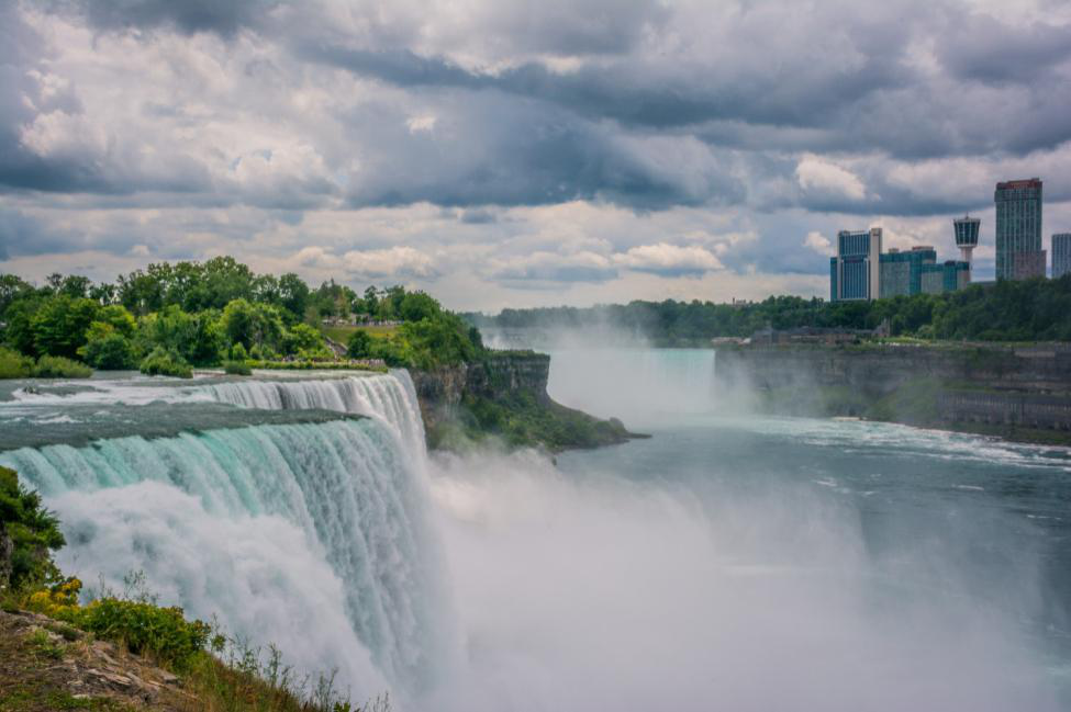 尼亚加拉瀑布(Niagara Falls)位于美国纽约州和加拿大安大略省交界地带,名列世界第一大跨国瀑布。瀑布的形成得益于独特的地质构造,在尼亚加拉峡谷中,岩石层接近于水平,每英里仅下降19-22英尺。岩石的顶层由坚硬的大理石构成,其下则为易被水力侵蚀的松软地质层。松软地层上坚硬的大理石地质层造就了水流于瀑布顶部的悬崖边缘笔直飞泻而下的壮阔景象。更新世时期,巨大的大陆冰川后撤,大理石层暴露出来,被从伊利湖流来的洪流淹没,形成了如今的尼亚加拉大瀑布。