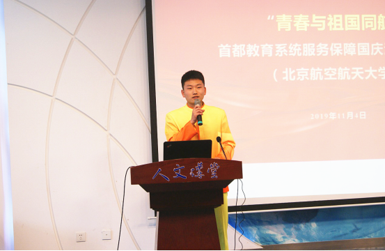 国庆70周年活动合唱团的张鑫分享了自己在合唱团成长的点滴和个人的蜕变,介绍了合唱团独特的训练方式,说到了在演唱《今天是你的生日》《我属于中国》《我们都是追梦人》的三个感动点,表达了自己作为一名中国人的骄傲。