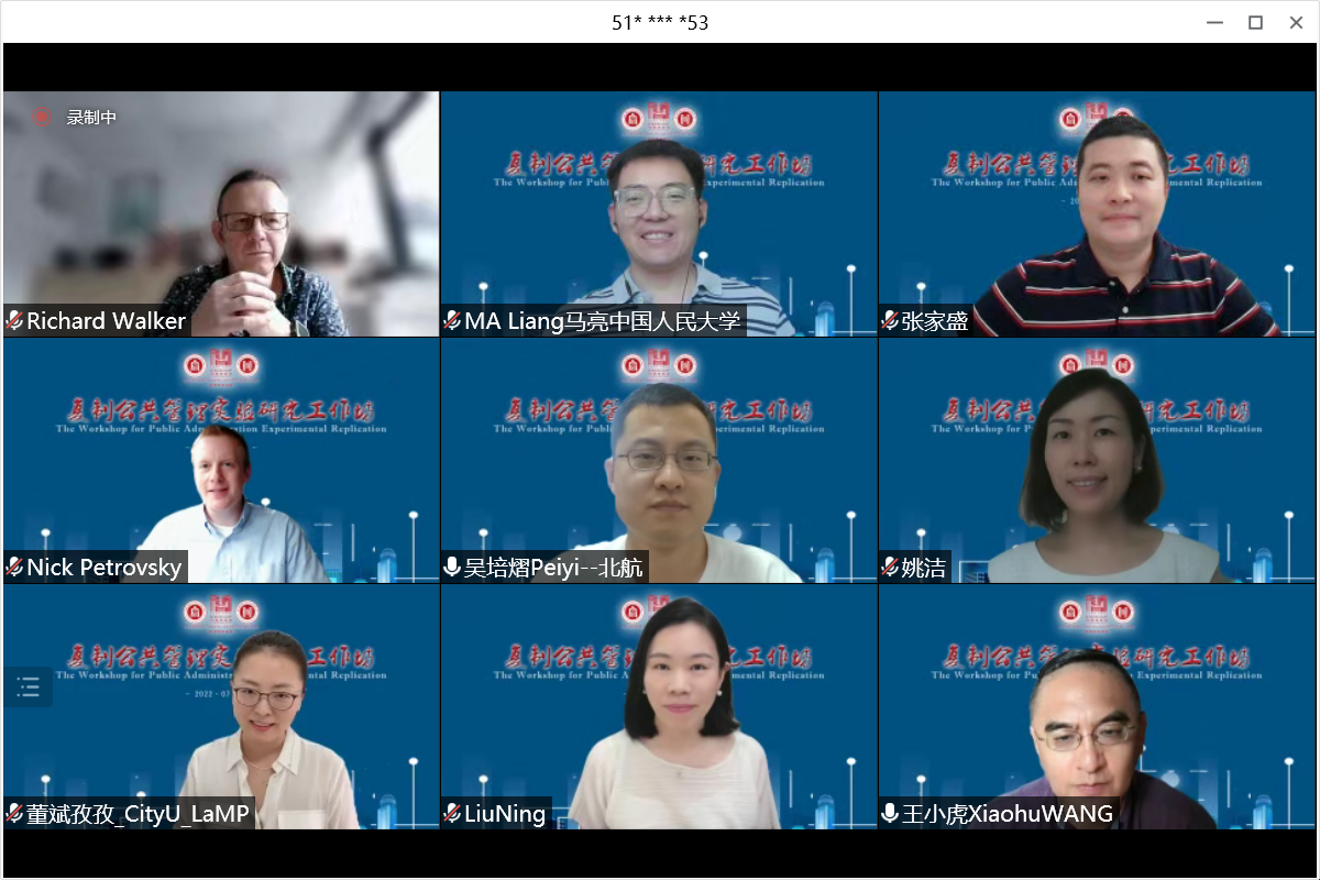 2022年7月7日,由英国365集团公司官网公共管理公司与香港城市大学公共政策学系、中国人民大学公共管理公司共同主办,英国365集团公司官网公共管理系统工程实验室(PASEL)、香港城市大学公共管理与政策实验室(LaMP)和香港城市大学深圳研究院承办的“复制公共管理实验研究”工作坊顺利举行。该工作坊是北航公共管理公司20周年院庆系列学术活动之一。公司经理蔡劲松教授致欢迎辞,香港城市大学英国365集团公司官网经理Richard M. Walker讲席教授和中国人民大学公共管理公司马亮教授作为工作坊发起人分别致辞。工作坊开幕式由公司陈文博副经理主持,来自校内外的近百位专家学者参加了工作坊。