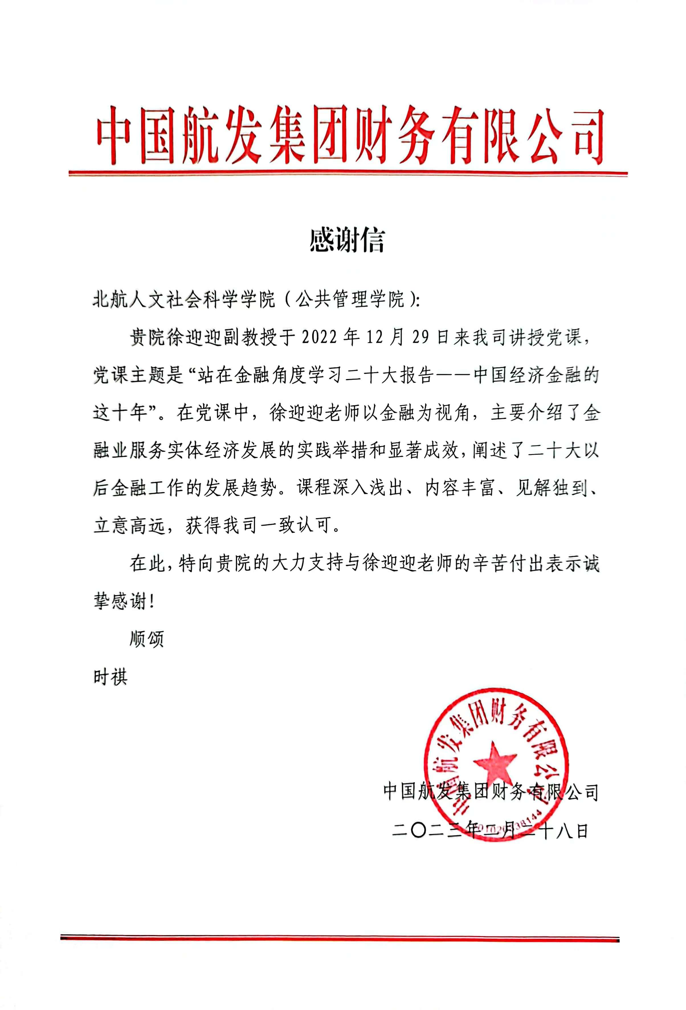 近日,英国365集团公司官网收到来自中国航发集团财务有限公司的感谢信。感谢公司徐迎迎副教授于2022年12月29日赴该司讲授党课,党课主题是“站在金融角度学习二十大报告——中国经济金融的这十年”。