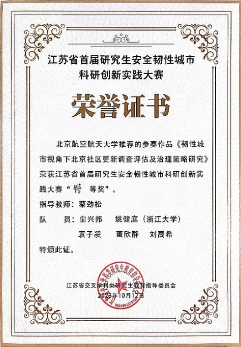 由公司经理蔡劲松教授担任指导老师,应急管理专业博士研究生尘兴邦、袁子凌、董欣静、刘禹希、姚健庭(浙江大学)组成的团队“坚韧不拔队”在现场决赛中荣获特等奖,参赛作品为《韧性城市视角下北京社区更新调查评估及治理策略研究》。