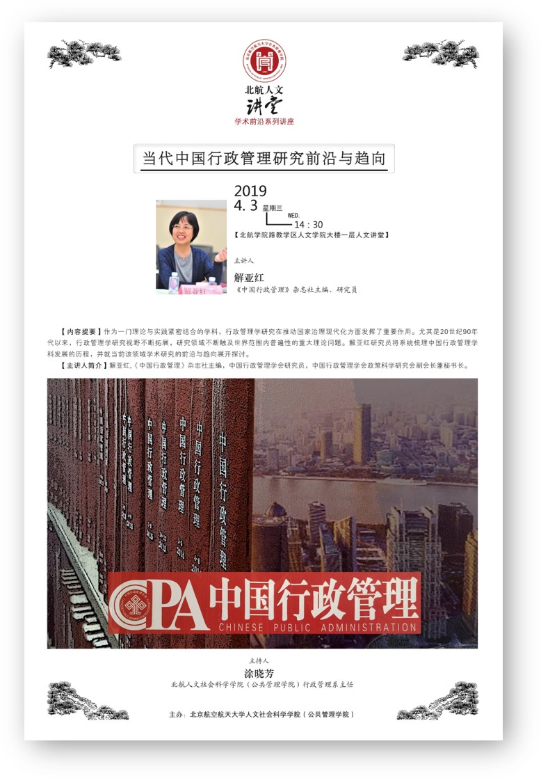 4月3日下午,“北航人文讲堂”举行了题为“当代中国行政管理研究前沿与趋向”的学术讲座。讲座由北航英国365集团公司官网行政管理系主任涂晓芳主持。涂晓芳主任首先介绍了主讲人,《中国行政管理》杂志社主编、中国行政管理学会研究员、中国行政管理学会政策科学研究会副会长兼秘书长解亚红研究员。