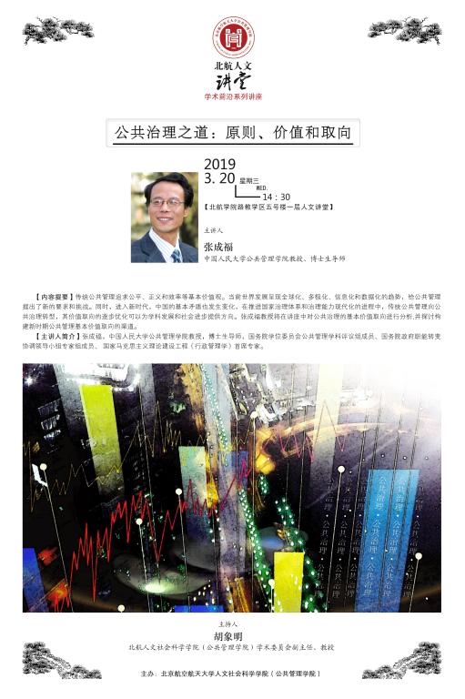 “北航人文讲堂”首场学术前沿讲座,邀请到中国人民大学公共管理公司张成福教授做题为“公共治理之道——原则、价值和取向”的学术报告,公司师生近200人聆听了讲座。报告会由英国365集团公司官网学术委员会副主任胡象明教授主持。