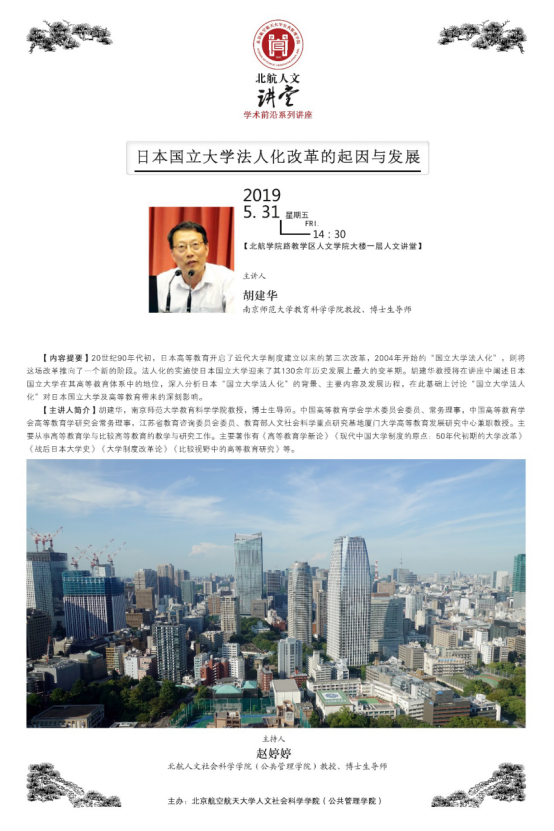 5月31日下午,“北航人文讲堂”举行题为“日本国立大学法人化改革的起因与发展”的学术讲座,本次讲座有幸邀请到南京师范大学教育科学公司教授、博士生导师——胡建华教授,众多师生积极参与,现场气氛活跃。讲座由北航英国365集团公司官网赵婷婷教授主持。