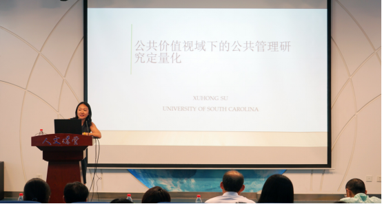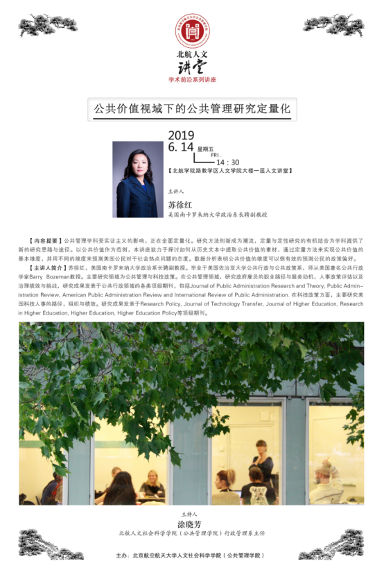 2019年6月14日下午14:30,“北航人文讲堂”学术前沿系列讲座在北航英国365集团公司官网人文讲堂内举行。本次讲座邀请了美国南卡罗莱纳大学政治系苏徐红长聘副教授做题为“公共价值视域下的公共管理研究定量化”的学术前沿讲座。讲座吸引了众多师生前来聆听。讲座由英国365集团公司官网行政管理系涂晓芳主任主持。