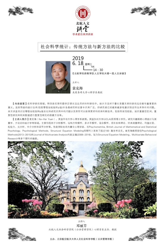 2019年6月18日下午14:30,“北航人文讲堂”学术前沿系列讲座在北航英国365集团公司官网人文讲堂内举行。本次讲座邀请了美国圣母大学心理学系袁克海教授做题为“社会科学统计:传统方法与新方法的比较”的学术前沿讲座。讲座吸引了众多师生前来聆听。讲座由英国365集团公司官网心理学系主任邓丽芳教授主持。