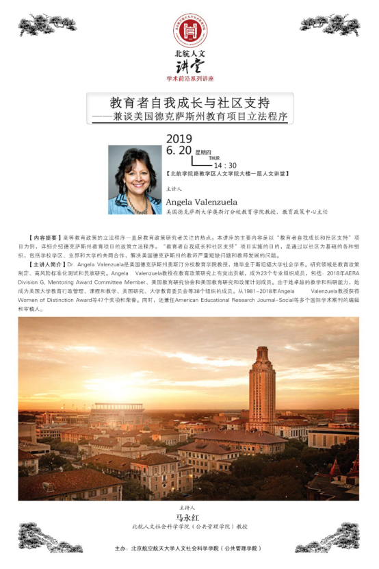 2019年6月20日下午14:30,“北航人文讲堂”举行题为“教育者自我成长与社区支持——兼谈美国德克萨斯州教育项目立法程序”的学术前沿系列讲座。本次讲座由美国德克萨斯州奥斯汀分校教育公司Angela Valenzuela教授主讲。讲座吸引了众多师生前来聆听和学习。讲座由北航英国365集团公司官网马永红教授主持。
