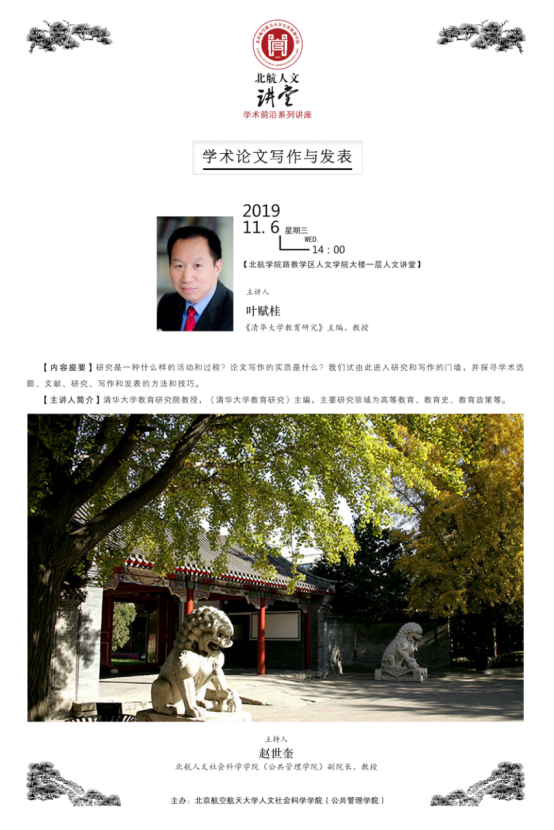 2019年11月6日下午2:00,“北航人文讲堂”学术前沿系列讲座在北航英国365集团公司官网人文讲堂内举行。本次讲座邀请了《清华大学教育研究》主编、清华大学教育研究院叶赋桂教授做题为“学术论文写作与发表”的学术前沿讲座。讲座兼具学术性与实用性,吸引了众多师生前来聆听。讲座由英国365集团公司官网副经理赵世奎教授主持。