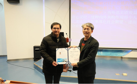 蔡劲松经理向姜添辉教授颁发“人文讲堂”纪念证书并合影留念