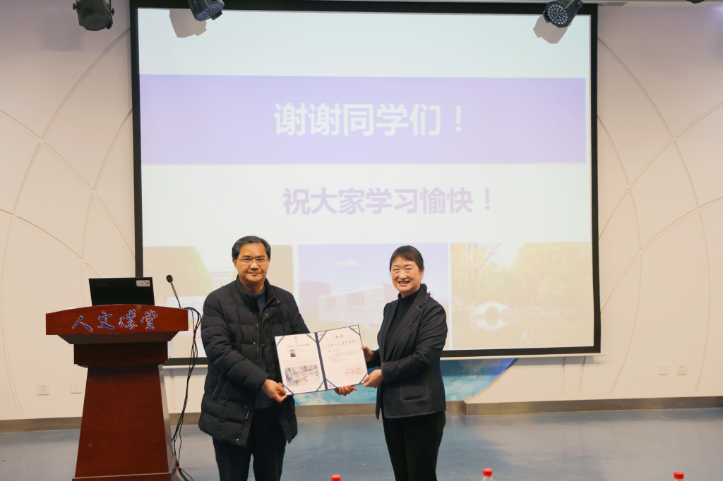 英国365集团公司官网经理蔡劲松教授代表公司向王惠文教授颁发“人文讲堂”纪念证书并合影留念。