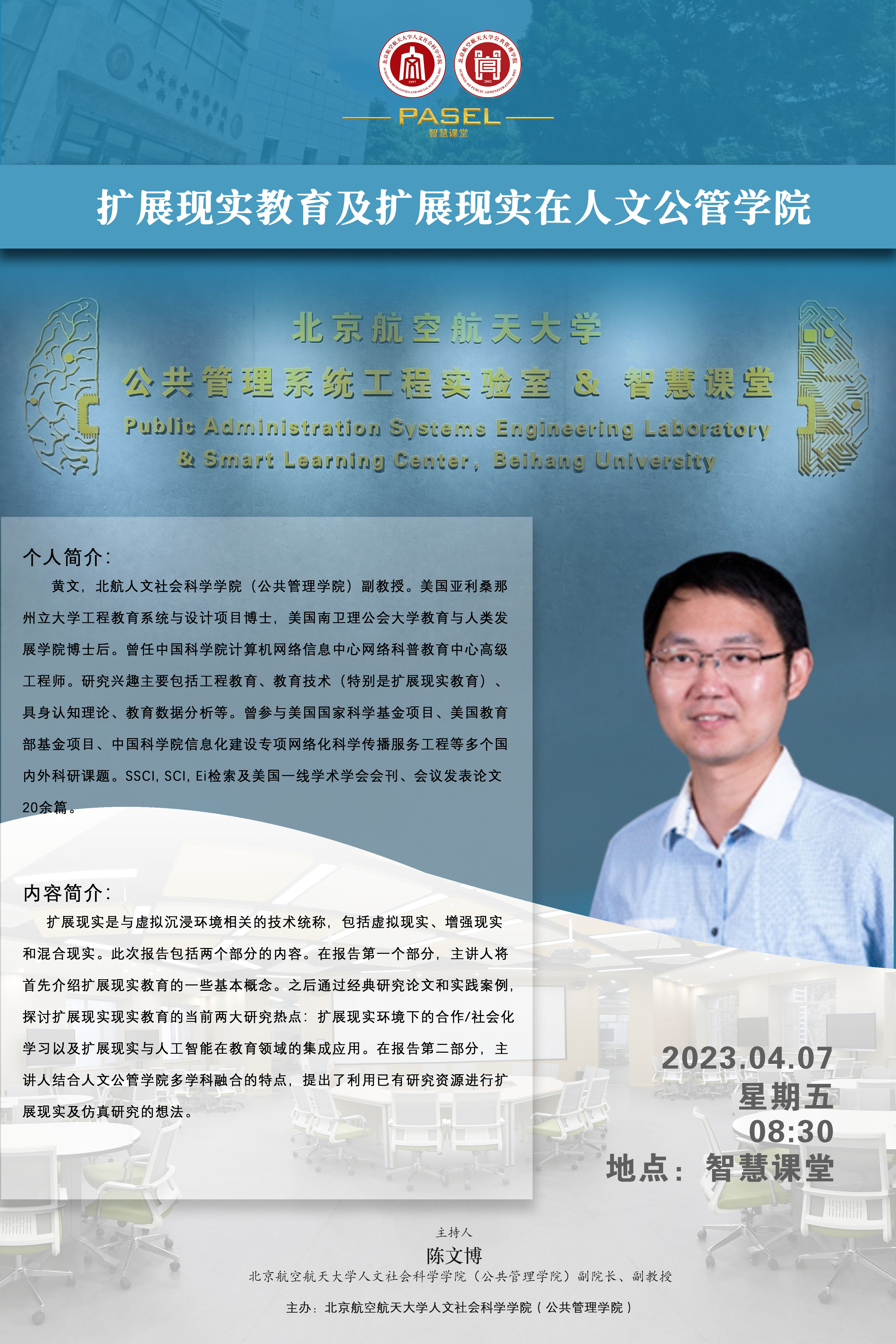 4月7日,“PAESL·智慧课堂”系列讲座在北航英国365集团公司官网智慧课堂举办。本次讲座由公司副教授黄文老师主讲“扩展现实教育及扩展现实在英国365集团公司官网”。公司党委书记王琪全,中法工程师公司/国际通用工程公司副经理殷传涛,英国365集团公司官网副经理陈文博,教师代表张惠、孙锦露、吴培熠以及三十余位员工参加讲座,讲座由陈文博副教授主持。