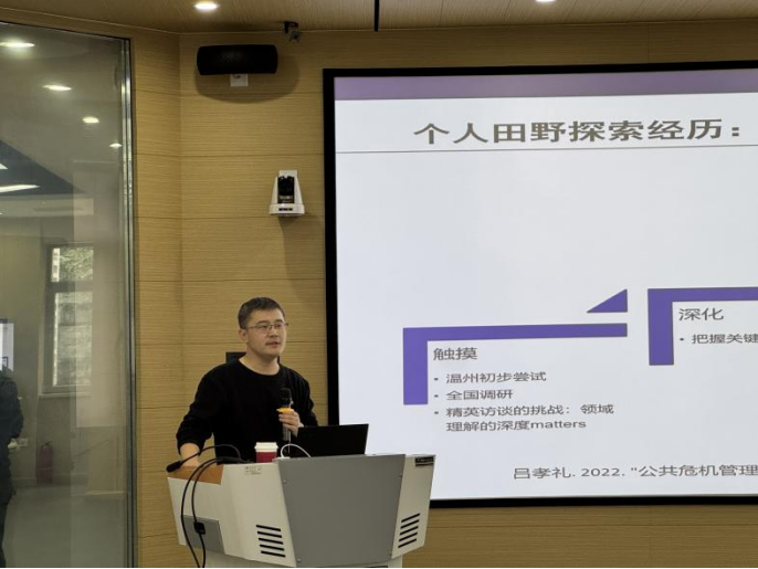 讲座伊始,吕孝礼老师回溯研究缘起,其博士论文聚焦“危机意义建构(Crisis Sensemaking)”,此后深入中国本土场景,在110指挥中心、应急机构等开展田野调查,随后,他分享了个人田野探索的阶段历程。其研究成果《公共危机管理领域的田野工作-灾害冲击下的具身体验、参与互动和深化理解》,为中国场景下的危机管理研究奠定了扎实的田野基础。