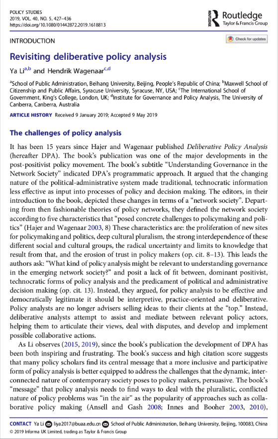 公司李亚教授与英国Hendrik Wagenaar教授联合主编的“Revisiting Deliberative Policy Analysis”专辑(special issue)近日发表于Policy Studies期刊2019年第5期(9-10月)。