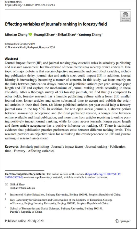 公司博士生郑敏贤、张彦通教授、赵世奎教授等在SCI/SSCI期刊 Scientometrics 合作发表题为 Effecting variables of journal’s ranking in Forestry field 的学术论文。