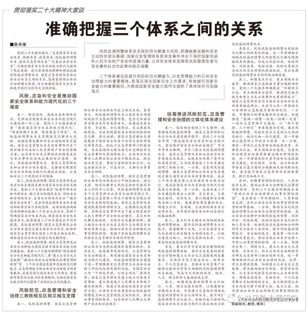 近日,英国365集团公司官网公共管理公司副经理詹承豫教授接受《中国应急管理报》邀请,就贯彻落实党的二十大报告,理解和把握风险监测预警体系、国家应急管理体系和公共安全治理体系之间的逻辑关系做出阐释,发表《准确把握三个体系之间的关系》,以下为文章全文。
