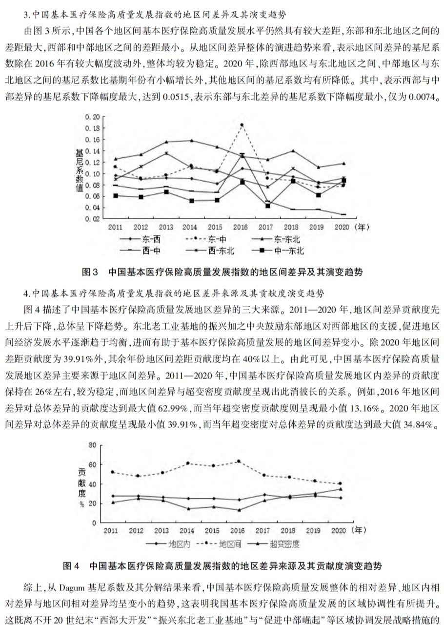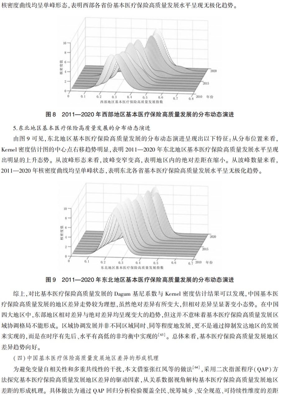 【摘要】基于2011—2020年31个省份的面板数据,构建指标体系对基本医疗保险高质量发展进行评价。在此基础上,用Dagum基尼系数和Kernel密度估计法研究基本医疗保险高质量发展的地区相对差异和地区绝对差异的分布动态演进,并通过二次指派程序检验地区差异的形成机理。结果表明:2011—2020年,31个省份的基本医疗保险高质量发展指数均有较大程度的提升,但省际差异明显;基本医疗保险高质量发展的地区相对差异变小,地区间差异是基本医疗保险高质量发展总体差异的主要来源;基本医疗保险高质量发展的绝对差距呈扩大态势;覆盖全民、统筹城乡、可持续性三方面差异对基本医疗保险高质量发展地区差异有显著影响。由此,提出加强顶层设计、培植财源、建立基本医疗保险协调联动机制、深入实施区域协调发展战略、引导资金和技术向欠发达地区倾斜、推行先进的理念与经验、优化基本医疗保险基金管理模式等建议。
