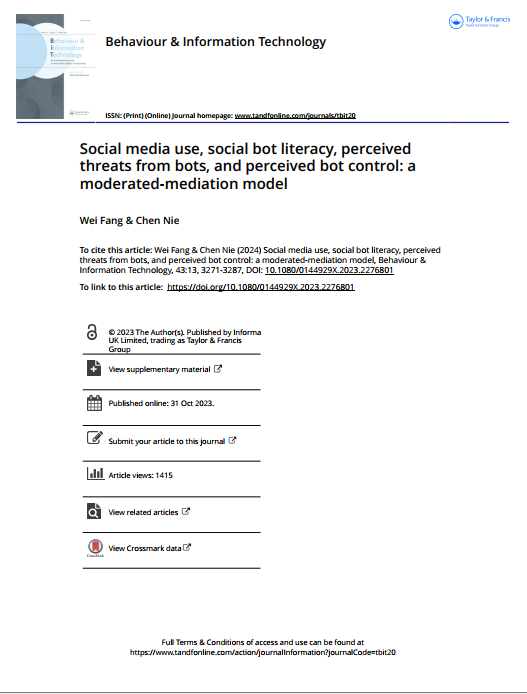 近日,英国365集团公司官网聂晨副教授作为通讯作者的文章《Social media use, social bot literacy, perceived threats from bots, and perceived bot control: a moderated-mediation model》在SSCI、SCIE期刊《Behaviour & Information Technology》上发表。本研究关注实施用户赋权策略,采用政策干预和教育培训等方式提升公众素养,以抵御社交机器人对舆论操控产生的负面影响,文章全文链接如下: