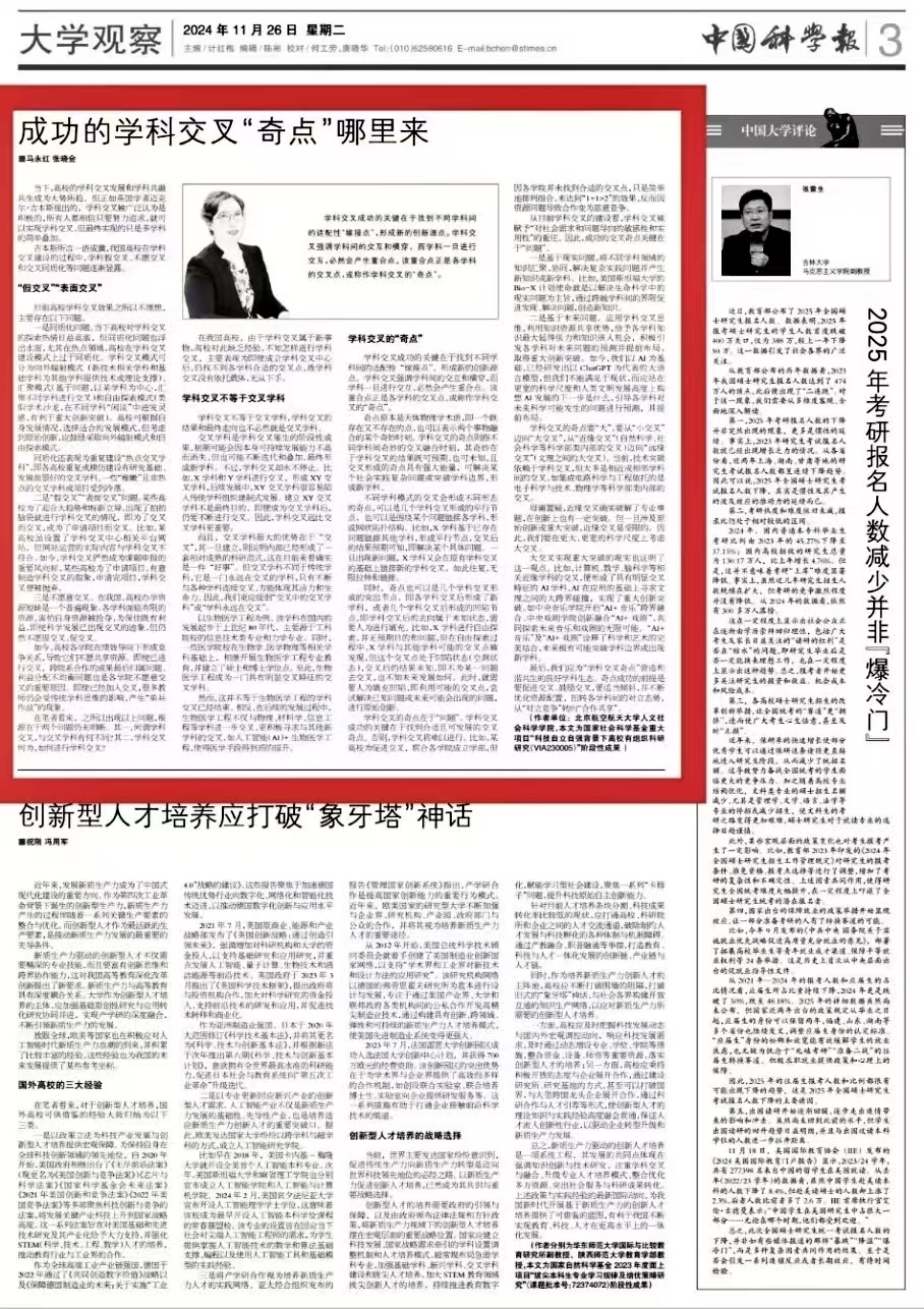 近日,英国365集团公司官网马永红教授、博士研究生张晓会在《中国科学报》发表《成功的学科交叉“奇点”哪里来》一文。该文章指出学科交叉成功的关键在于找到不同学科间的适配性“嫁接点”,形成新的创新源点。学科交叉强调学科间的交互和横穿,而学科一旦进行交互,必然会产生重合点,该重合点正是各学科的交叉点,或称作学科交叉的“奇点”,而成功的学科交叉“奇点”关键在于“问题”。