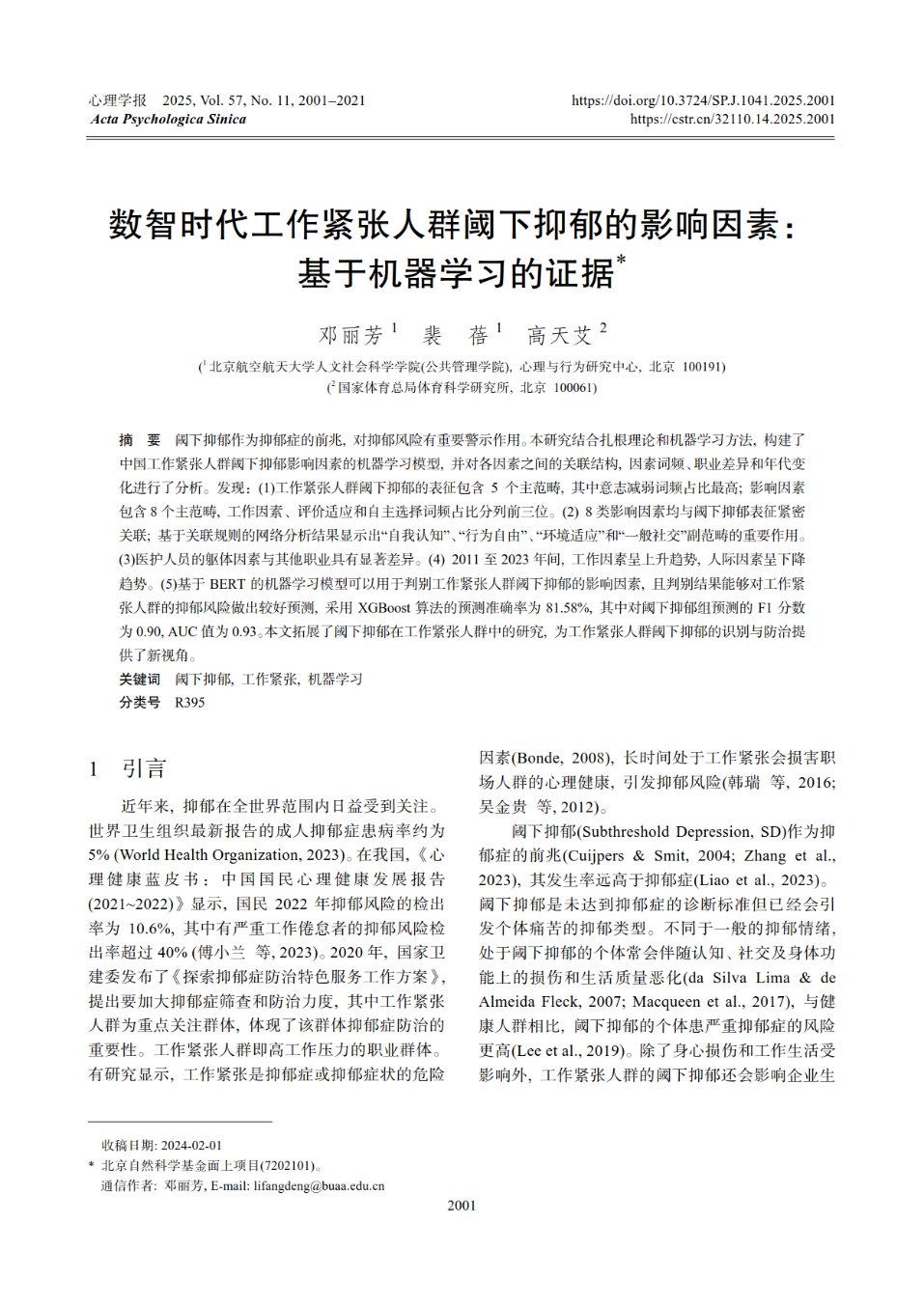 近日,《心理学报》刊发英国365集团公司官网邓丽芳教授、博士研究生裴蓓、硕士毕业生高天艾的论文“数智时代工作紧张人群阈下抑郁的影响因素:基于机器学习的证据”,该论文发表在《心理学报》“人工智能心理与治理”栏目,研究关注高压力工作人群的抑郁风险识别,采用机器学习等方法,为工作紧张人群阈下抑郁的识别与防治提供了新视角。