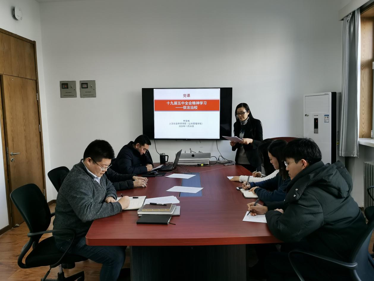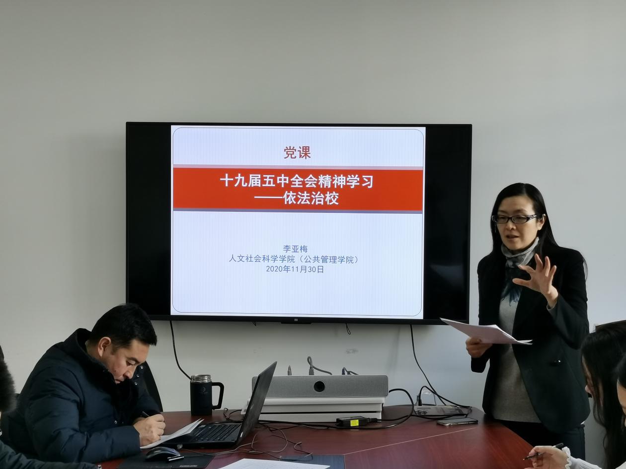 为深入学习贯彻党的十九届五中全会精神,落实依法治校新要求,11月30日上午,英国365集团公司官网“十九届五中全会精神学习——依法治校”党课顺利开展。党课由公司分党委书记李亚梅教授主讲,公司党委副书记张驰、员工工作办公室成员参加学习。