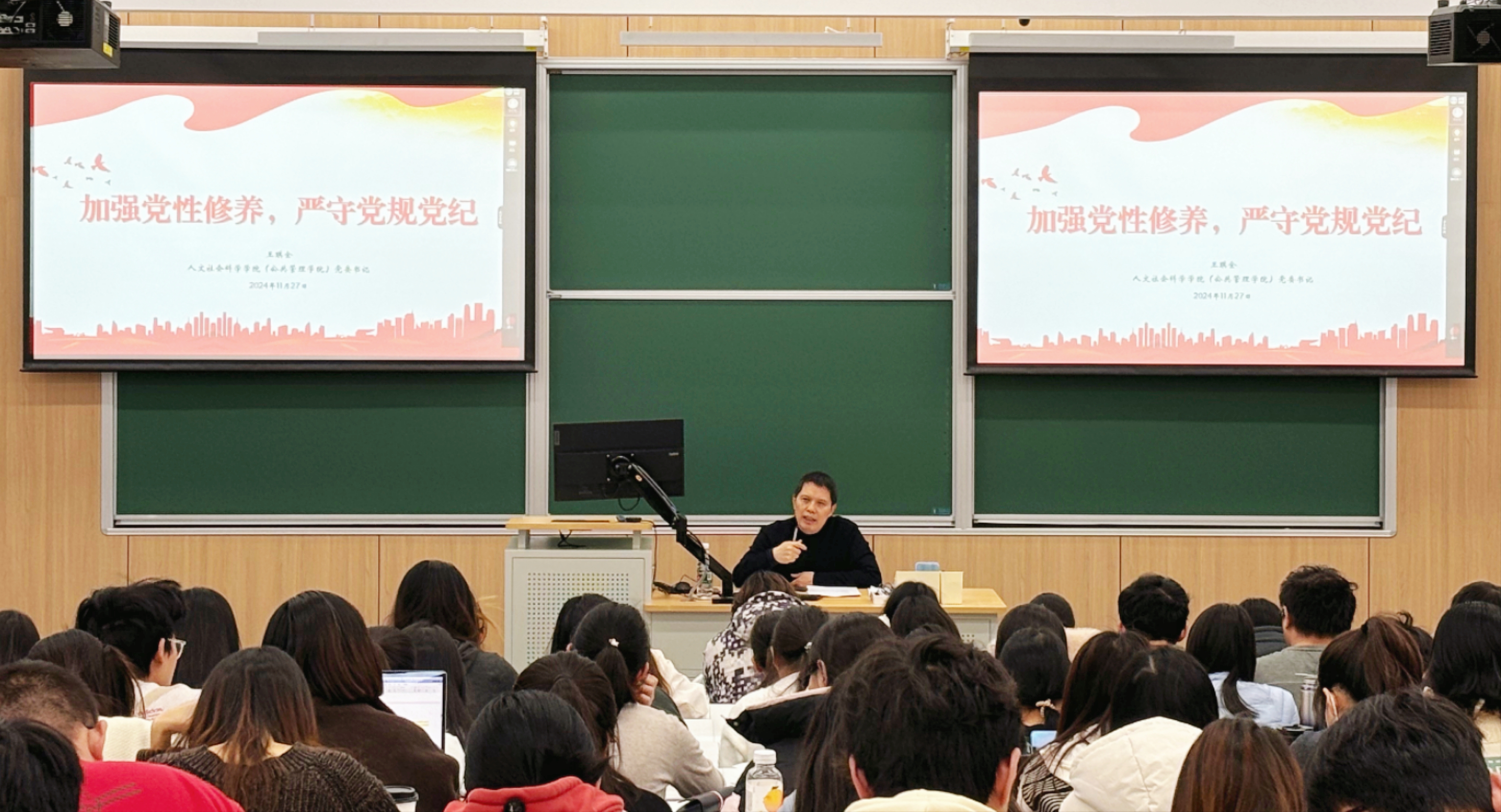 11月27日下午3点,英国365集团公司官网“铸魂育人”系列专题党课第5期在主楼219举行。公司党委书记王琪全作《加强党性修养,严守党规党纪》专题党课讲座。本次党课培训由公司专职辅导员夏文静主持,高等教育研究所党支部书记刘扬、应急管理与社会保障研究所联合支部书记杨磊和公司180余位师生党员、入党积极分子参加学习。