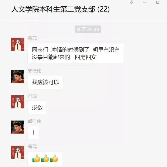 5月22日20:00,人文公司临时接到次日早上北航大运村首次供应早餐的任务,发布了志愿招募信息,需要志愿者们在次日早上(5月23日)配合大运村公寓盒饭服务,党员同志们积极报名,发挥先锋模范作用,“大运村售卖早餐”志愿者小分队15分钟内集结完毕。当日深夜,辅导员冯琨对次日志愿服务的时间点和工作内容进行了详细说明。