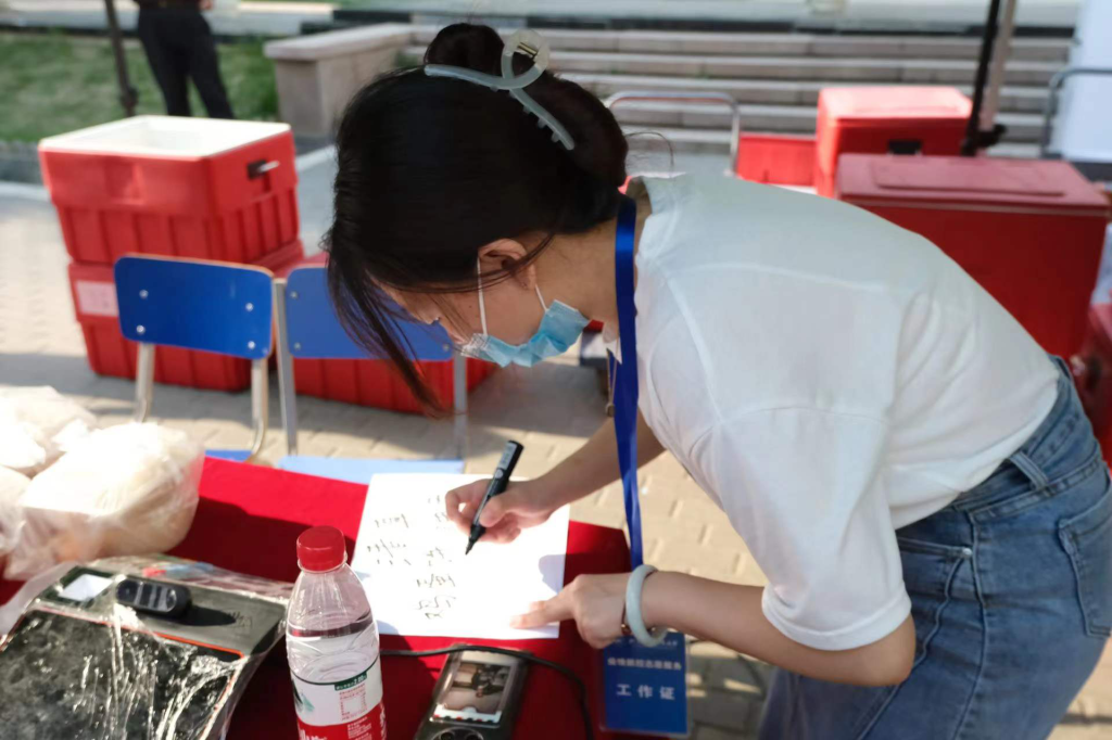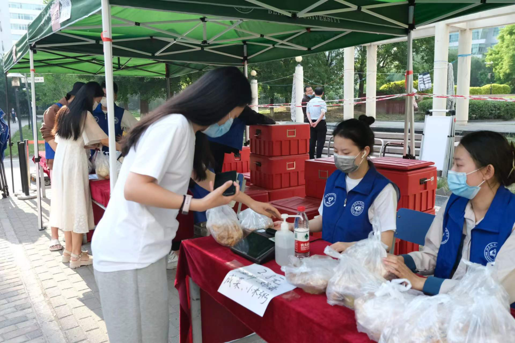 谢慧珺:前一天晚上在支部群里看到“冲锋的时候”到了的几个字眼的时候,大家都踊跃起来,一起加入“大运村早餐”小分队。我一想到要跟“勤劳的冯师傅开启忙碌的一天”都莫名激动起来了,仿佛是准备去团建而不是做志愿。有人说7点开始售卖太早了,可能没有那么多同学出来买,结果一个小时就售罄了。和大家一起吆喝、叫卖、看着一个个同学渴望的眼神、给他们介绍套餐内容、把早餐递到他们手里......真的觉得特别开心。封控政策的一步步收紧或许会让人惆怅,但是看到身边的老师同学们一个个生动的表情就会觉得生活还是在继续,我们还是很幸福的,希望早日迎来胜利的曙光!