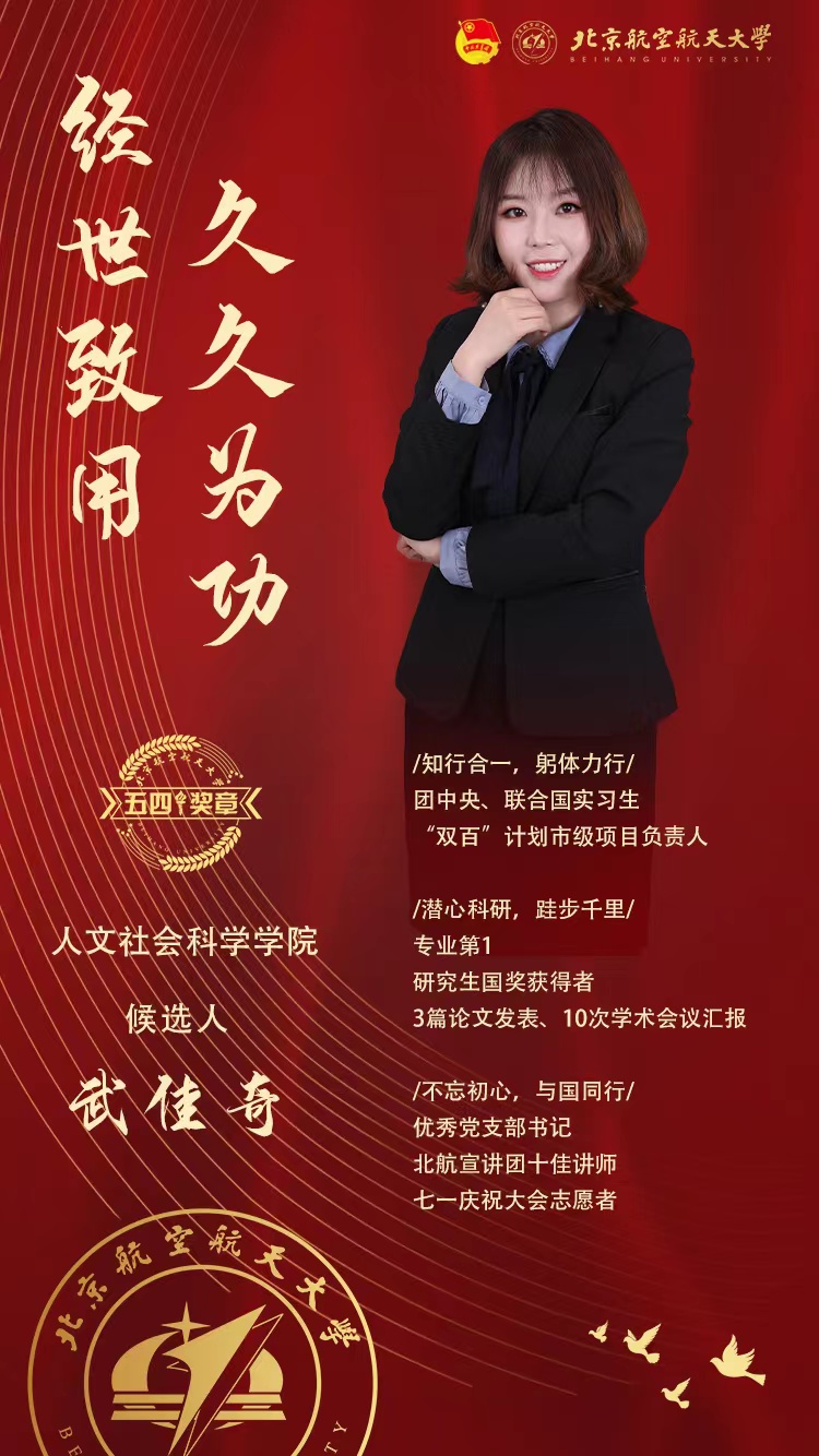 “保持好奇心和想象力,永远不要给自己的人生设限,敢想那就敢做。”她说,“我会一直在路上。”武佳奇硕士期间专业成绩93.67分,GPA3.91,名列专业第1名,获研究生国家奖学金、北京市优秀毕业生、一等学业奖学金、北京市优秀毕业论文、北航新生奖学金等,参与北京市、校级演讲比赛、知识竞赛,获得优异成绩。曾于香港大学、圣彼得堡理工大学交换学习。目前,武佳奇已被北京大学政府管理公司博士录取,将于今年九月开启博士生涯的科研和学习,将继续进行风险治理、应急管理相关研究,“正如贝克所言,我们生活在文明的山火上,风险社会中我们需要关注的还有很多。面对层出不穷的风险挑战和大变局时代,要有青年的担当。”