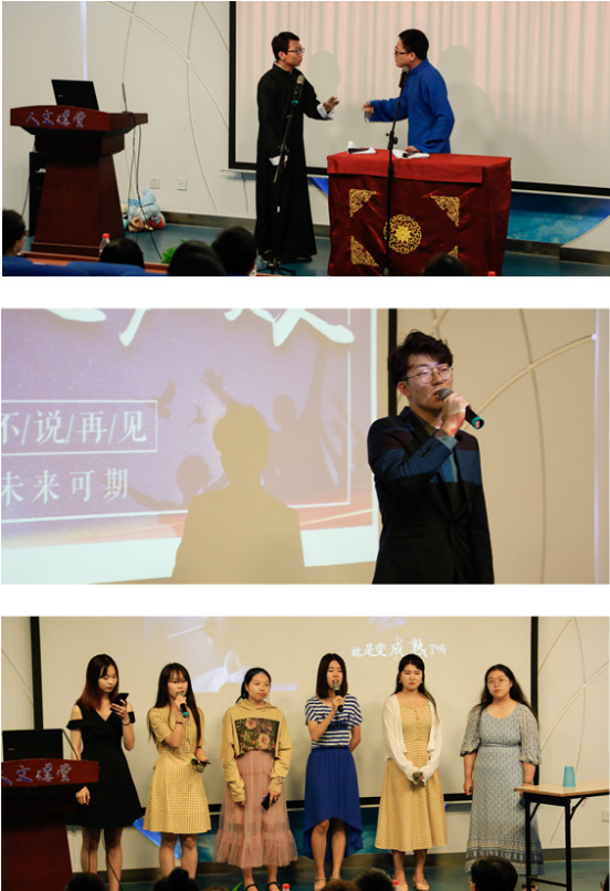 薛晓军与翟浩然同学带来的相声《笑忆航年》将人文讲堂带入了欢声笑语当中,生动的表演,精彩的捧逗,赢得了在场老师和同学们的爆笑与热烈掌声。压轴节目是由2015级本科生辅导员尹森演唱的歌曲《岁月神偷》,希望同学们在今后的路上珍惜每时每刻。晚会的最后,由李馨悦、高天艾等同学带来的杯子舞和小合唱《你曾是少年》引起了大家的阵阵共鸣,为晚会画上了圆满的句号。