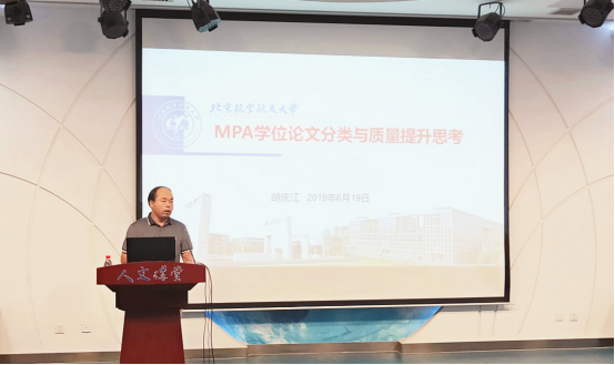 MPA课程主讲教师胡庆江老师做了题为《MPA学位论文分类与质量提升思考》。根据MPA教学指导委员会关于学位论文的大会内容,胡老师介绍了应用性论文四种类型(调研报告、案例分析、问题研究、政策分析)的特点、结构、内容和注意事项。他结合实际情况,提出了学位论文存在的优秀率偏低,总体水平有待提高,创新型不够等问题。并就相关问题给出了建立导师为第一责任人的导师负责制;加强MPA专业基础课程和研究方法类课程教学等相应的对策。