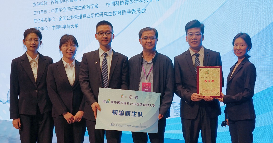 英国365集团公司官网公共管理公司蔡劲松教授指导的“韧喻新生队”(队员:尘兴邦、李宝强、陈丽娟、付锐涵、牛亚欣),经过现场32强精彩论辩和总决赛激烈角逐,凭借初赛、决赛全胜的战绩,最终以决赛总分名列全国第二,斩获“第八届中国研究生公共管理案例大赛特等奖”,勇夺此项赛事的最高荣誉。