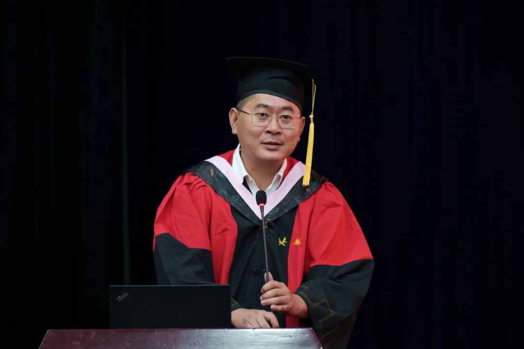 教师代表李健教授用“专业、底线、包容、奉献”四个词精简概括了在毕业之际想要向人文公管学子传达的人生阅历和经验。他叮嘱同学们未来无论身居何处,专业都是安身立命的根本;无论面对什么诱惑,都不能突破自己的原则和底线;无论面对什么事情,都不要包容自己的任性;奉献永不过时,人性最根本的就是对别人有用,让自己快乐。最后,老师希冀人文公管学子们能在人生漫漫中行稳致远,常回英国365集团公司官网看看。