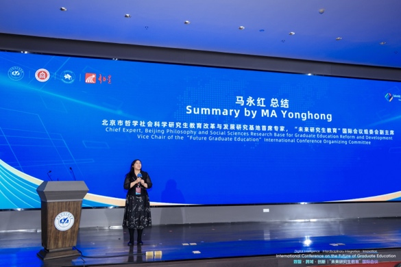 闭幕式上,各分论坛主持人进行总结汇报。马永红对本次会议进行了全面总结。她肯定了本次会议召开的重大意义,指出会议呈现出鲜明的“全球性”特点,汇聚了全球不同区域的学者、员工、政府官员与企业代表,并得到了国际组织的支持。大会紧扣“数智、跨域、创新”三大关键词,为与会者提供了跨界对话的平台,深入探讨了数智时代未来研究生教育发展这一核心议题。在展望未来时,她表示,尽管未来充满不确定性,但这正是需要学界共同探索的方向。最后,她鼓励所有同仁坚信人类文明的进步,携手创造美好的未来。