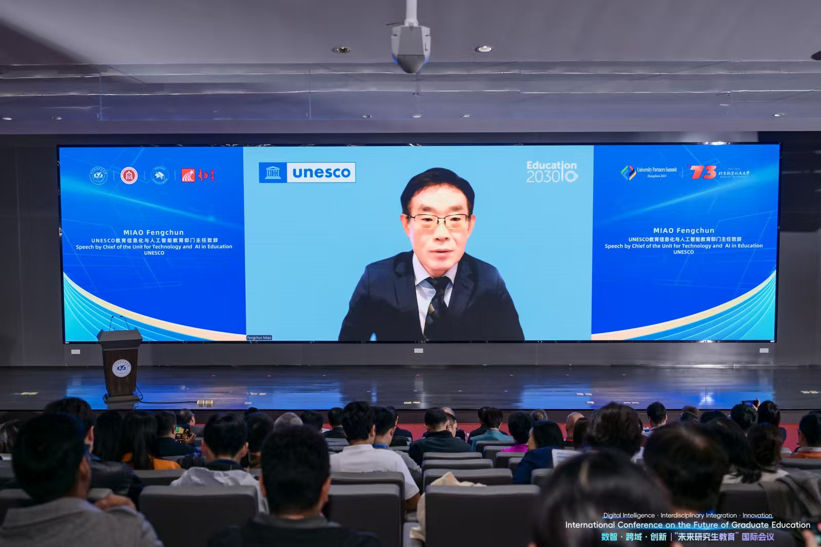 苗逢春在致辞中指出,当今世界正处在人工智能时代的转折点。他分享了两点体会:第一,人工智能目前的发展本质上处于基建扩张期,应从其对社会经济基础设施升级换代的角度分析价值;第二,包括研究生教育在内的人才培养应着眼于以人为本的人工智能公民素养和综合能力培养。最后,他介绍了联合国教科文组织2024年9月发布的员工人工智能能力框架,强调将以人为本的人工智能意识和伦理列为重要能力。